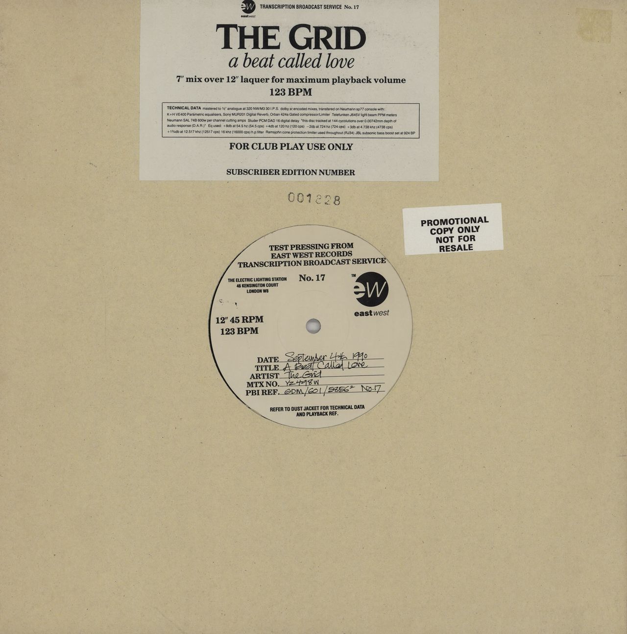 THE GRID A Beat Called Love (1990 UK Transcription Broadcast Service single-sided limited edition mock [but entirely intentional and genuine!] 12" vinyl test pressing with numbered custom title label. Housed in an opened title stickered die-cut card sleeve. This is a standard retail release, but this copy has a promotional sticker on the front of the sleeve YZ498W)
