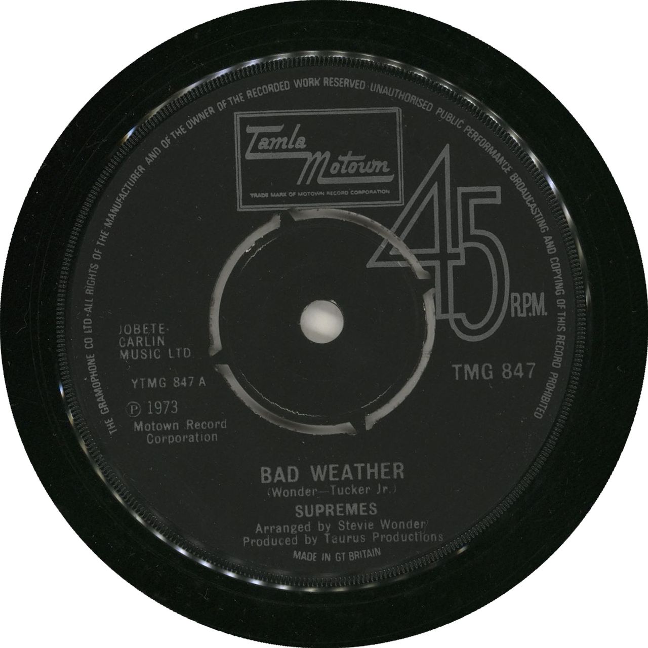 THE SUPREMES Bad Weather (1974 UK 7" vinyl single with four prong centre, also featuring It's So Hard For Me To Say Goodbye, plain die cut paper sleeve TMG847)